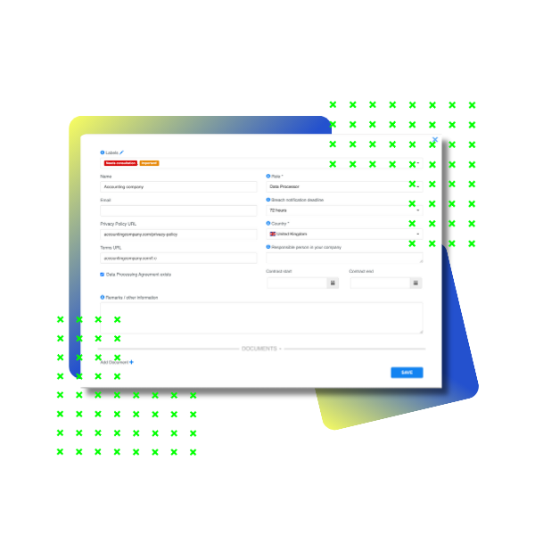Ensure every vendor relationship is compliant and aligned with your data protection standards by documenting security measures, due diligence results, and contractual safeguards. This helps you identify high-risk vendors, demonstrate compliance during audits, and maintain trust with clients and regulators.